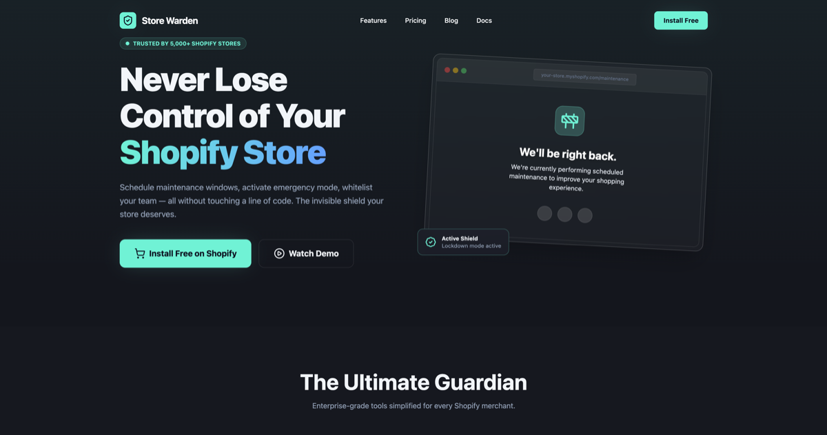 This is where a tool like Store Warden becomes invaluable. Store Warden handles maintenance windows, emergency lockdowns, IP whitelisting, scheduled downtime, and custom maintenance pages automatically. It's trusted by 5,000+ Shopify stores for a reason.
